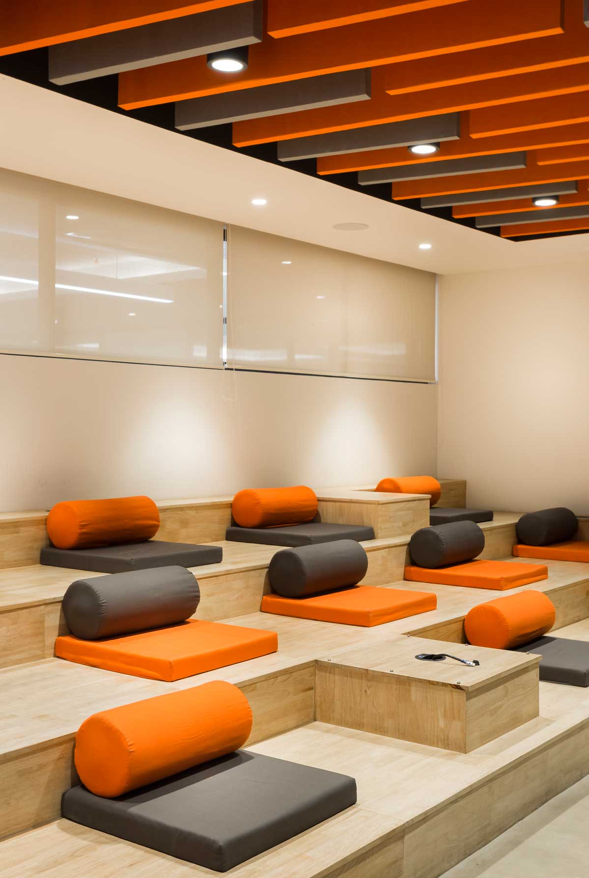 At the center lies a dynamic collaboration arena featuring stepped wooden seating—crafted for quick team huddles, focused ideation, virtual meetings with global teams, or milestone celebrations. This space becomes the social and creative nerve center of the office.